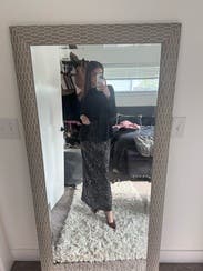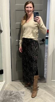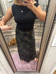 Loved this skirt. So comfortable and I loved the length of it. Super flattering and easy to pair with