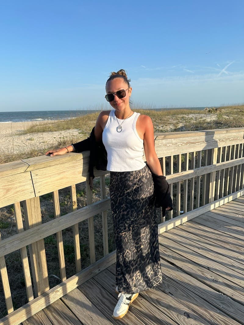 The Bryony Skirt by AllSaints features a chic brown animal print with a pull-on silhouette, making it both comfortable and stylish. Its midi length and fluid design make it versatile for pairing with everything from chunky knits to sleek blouses for any occasion.