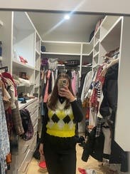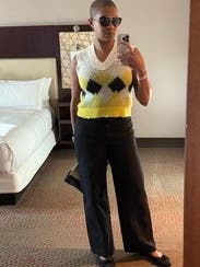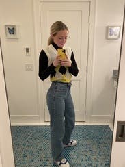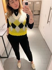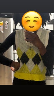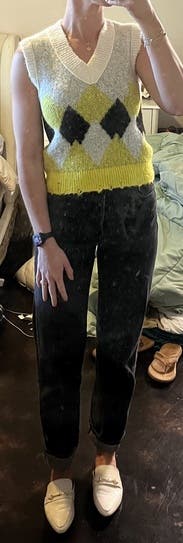 I truly love this sweater vest. Would’ve bought it, but you can only own so many. It’s very soft and the colors are great. Looks great with jeans and black denim. I wore it with ankle cropped wide leg jeans and a pair of white platform, tennis shoes. I definitely would recommend this. It is a very unique sweater vest