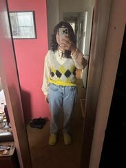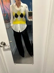 This one was probably ok the first wear but it stretches from multiple uses! A decent pattern but sort of an ugly shade of yellow, much more green in it that turns into a sort of muddled brown. Weirdly high necked despite being a v-neck so you don’t see any undershirts unless it’s a turtleneck. Was also thicker and made it hard to tuck in to look a bit cuter.