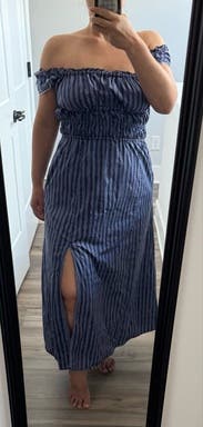 This was a nice dress, fits well and comfortably. Personally, not a favorite, but still wore it. Happy it fit me on top perfectly and was all elastic so it was comfortable. Really nice square neckline with a cap sleeve which were great details as well. What I didn’t like was the dress was a tad bit heavier than expected, skirt is very full and hated that the lining showed in the slit, even after pressing it. Could have just been this specific one but otherwise it’s a great dress. Wore it to a friends baby sprinkle so it was perfect for the occasion. I’m 5’1, the length was also good to wear with a 3” block heel. It is a great dress just not my preference.