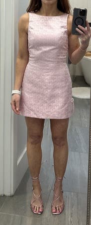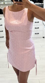 Flirty and feminine, this pink mini dress shines with its satin finish and subtle print. The side-tie details add a playful touch, making it perfect for date nights, parties, or a girls’ night out. I’m just obsessed!! It’s so feminine and cute. It’s a little tight on the sides because of the shorts so if you have fat legs like me be aware