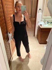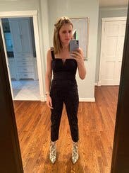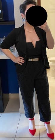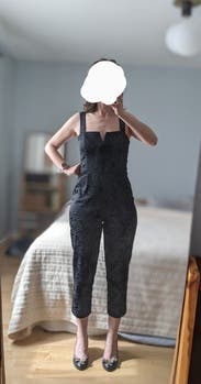 This was a very fun, comfortable jumpsuit. I liked the fabric detail, which made it feel fancy enough for a wedding. I loved that I could wear it with or without a bra. I'm a 4-6 on top and an 8 on the bottom, very pear shaped, and it was not the most flattering, but I still loved wearing it.