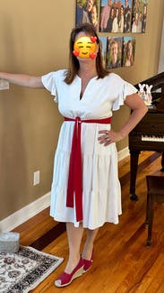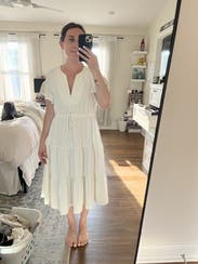 Wore for my 30th wedding anniversary, lovely dress with an informal casual bridal vibe. Tie waist. Light material. Dressed down with sneakers could be dressed up easily as well. Loved!