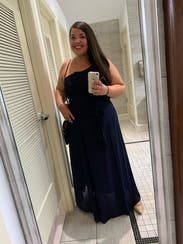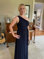 Loved the style of this dress. The color is a deep navy and the fabric flows beautifully. I ordered a 12, and was just able to zip it up...would probably have sized up to a 14 if available just to have a little more room. The length was a little long for me, even with heels - was able to walk fine, but had to be careful going up stairs, dancing, etc. Overall, a very versatile gown and easy to style in different ways with accessories.