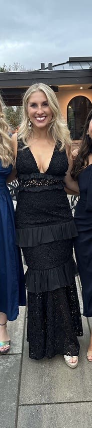 Perfect dress for a black-tie optional wedding. Formal but the lace gives a fun more casual aspect to it. Unlined lace on the bottom made it easy to dance and walk in. I used boob tape to give me a little more cleavage and i did need platform heels to make the length work. Got so many compliments. A must rent