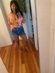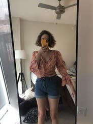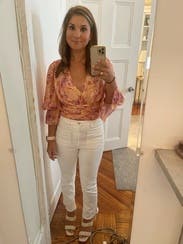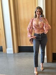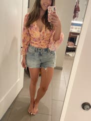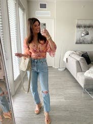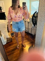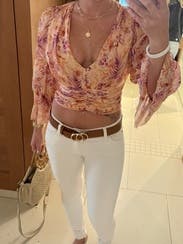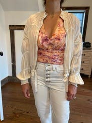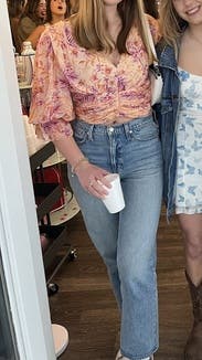 I really liked this top a lot, but it was shorter than expected and definitely showed off a little bit of my stomach-- even with high waisted jeans. So if that isn't your style, then I wouldn't recommend renting!