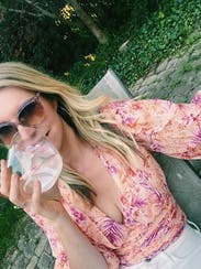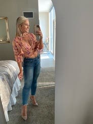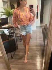I really loved the color and fabric of this top! The cut was really flattering, but I should've gone a size up as the bottom band was WAYY too tight. I wore it out to drinks (I knew I couldn't eat in it) and I could barely sit down in it. Otherwise really cute top!!
