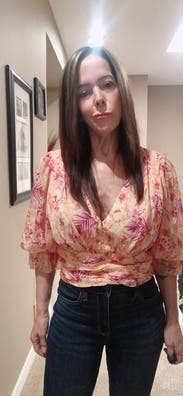 Loved this top so much that I wanted to keep it! The fabric, pattern and fit are stunning and so flattering. It's definitely cropped and I wish I had a small, since the XS squished my boobs down. I'm a 34B and a size 4 for reference.