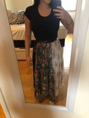 Lovely floral pattern, and the waist was comfortable and not too tight. It is the perfect length for stepping (tripping) on while walking upstairs and rolling over with your desk chair, so be mindful of this. Overall a nice easy rent to mix up for work week wear.