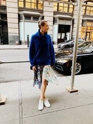 Absolutely LOVE this skirt. The colors, the contrast of the blue and the white section, is everything. The fit is so flattering, although I have to size up in this brand. Love how you can match it with so many colored tops.
