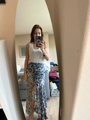 This skirt is lovely. It has a slit in the front where the material changes pattern. I styled it with and without the matching top. I really loved it, fit great on my 29-30” waist in the 6.