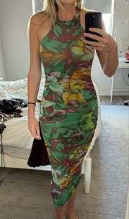 Loved this dress!!! I always find this neckline super flattering and the print was so fun. The rouging on the side was the perfect amount to make this very flattering on. The fabric is too layers of mesh that was great in the summer heat. I could see some finding this “see through” but i didn’t have an issue. Definitely a piece you can dress up or down and very bump friendly (29 weeks in picture).