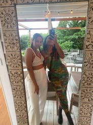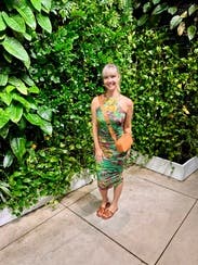 This dress is extremely flattering and forgiving. And I love the bright colors. Worked perfect for a nice dinner in LA. Only issue was the dress is tight all the way through down to the bottom. So I couldn’t take a full step forward when I was walking. I had to take mini steps which was kind of awkward.