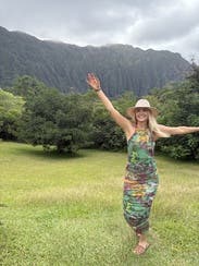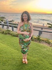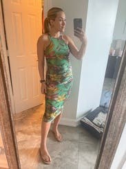 This dress exceeded my expectations and fit perfectly even at 30 weeks pregnant! There's great stretch throughout. I rented it with babymoon in Hawaii in mind and ended up wearing it at home with sneakers as well more casually because it was so comfy and fun.