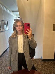 A very fun fit, if you style it just right! Didn't love enough to buy it, but a very fun look for the structured oversized blazer.
