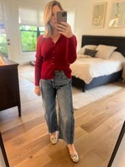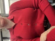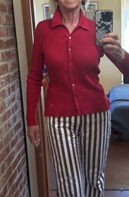 Pretty red color. Came new with the tags, a sweet cardigan, longer than expected.