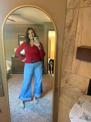 Beautiful true red - fitted but thick enough material to look nice. Loved that all buttons are fully functioning and you can adjust the look based on how you wear it. Cute and a solid rental for late summer/early fall.