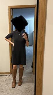 I loved this dress! It’s shapeless but in a good way, making it so easy to wear during the workday. It looked perfect with high boots. I wore it twice during the rental which I never do- hard to send this one back!