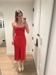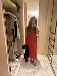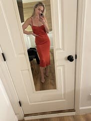 I wore this to a rehearsal dinner and got a ton of compliments. It fit perfectly! I’m 5’3 so it ended up hitting right at my ankle, but would be a true midi on someone taller and might not work for someone with a larger chest, as I couldn’t wear a bra with it.