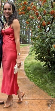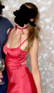 Loved this dress! Between the XS and S I ended up wearing the XS for a slightly more form-fitting look, though it was a bit harder to get on and off. Very chic and comfortable for dancing.
