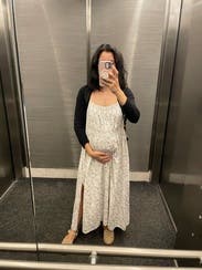 I sized up one size and wore this 32 weeks pregnant and it was perfect! (I’ve gained like 30 lbs so if on the smaller side of pregnancy, you may be able to wear your regular size because it is flowy.)