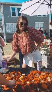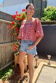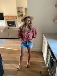 This top is cute! It's got some volume so I paired with a smaller, tighter short. I had a ton of room in this thing. Unless you've got wide shoulders or a pretty large bust I bet you can size down! It was really comfortable on a warm day outside.