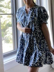 Blue floral cotton (100% Regenerative Cotton). A-line. Short sleeves. Crewneck. Front button closure. 34" from shoulder to hemline. Imported.