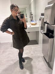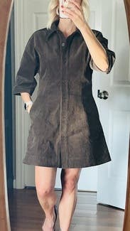 Very cute corduroy dress for fall. It’s light weight but warm for fall. Has a slight flair at the bottom and hits mid-thigh. The shoulders and arms are very wide, intentionally, but it felt too bulky for me. Definitely fits true to size and maybe slightly large.
