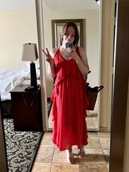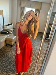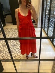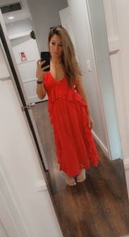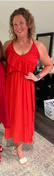 This dress is a tomato red. It has adjustable straps and elastic in the back. It’s a little thin which is great if you’re in a hot summer climate but if you’re worried about it being a little see through then you would definitely need a slip or something. I just wore it as is. I wore this with little white sneakers and it was super cute. I received several compliments.
