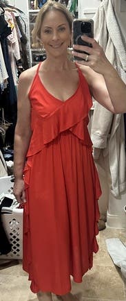 Wore this to a rehearsal dinner. Loved the bold color but wasn’t a huge fan of the fit. I was constantly adjusting the straps. Overall recommend!