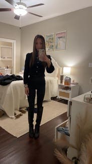 Really cute shirt-jacket but it’s tiny!! The other reviews are inaccurate. You must double up in size if you have a larger bust. I, sadly, have to rent another time because I couldn’t wear this size.