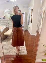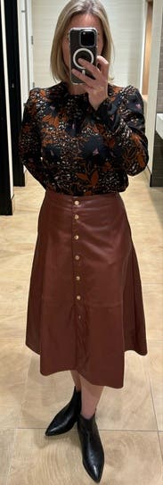 Such a great skirt! Fit like a glove (I wear a 4) and was so chic. Gold buttons down front are eye catching. Leather is soft and not hot. Really great look.