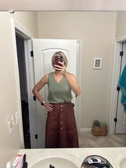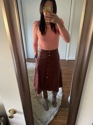 Love this skirt!!! It fit and felt great and had a 70s vibe. Love the gold buttons and color.