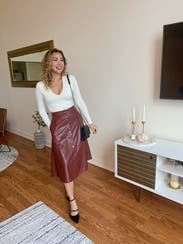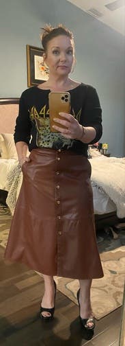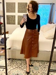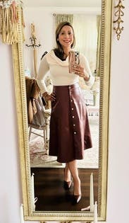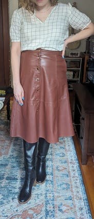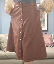 It has pockets and gold snaps (that didn't worry me about coming undone) with a great midi length. I enjoyed it! Looked great with the Rosetta Getty Denim Vest and the Kate Ford blouse, as well as the purple collared top by Tory Burch (all available on RTR). The "leatherette" is a little lower quality in this skirt than other brands I've worn from RTR but it was great to rent and was nice in the winter. Wearing the size Medium at 5'8, at about 138 pounds usually in a size 8 in most brands in these photos.