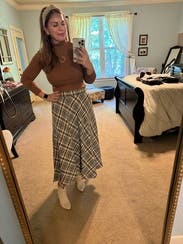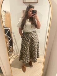 This plaid midi skirt brings a timeless, cozy charm to your wardrobe. It's perfect for pairing with a chunky sweater and knee-high boots.