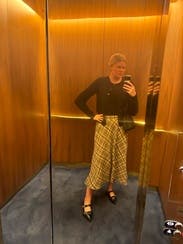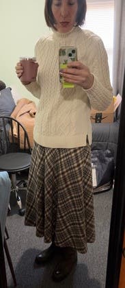 This was an amazing winter skirt. I never thought I could wear a skirt in the winter but it was 20 degrees and this thing kept me toasty even with bare legs. I wore tall boots. I wore this twice, once with a cream cable knit sweater (pictured) and once with a creamy yellowish cardigan over a cream cami. Will definitely rent again!