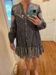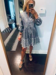 Loved the color and embellishments on this one. The cutouts go pretty far down the chest, so I needed a tank under to keep my bra from showing through. Comfy and roomy, but not much shape. Hits just above knees.