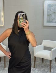 I wore this to a wedding and enjoyed it! It’s a simple black dress with some flare. Was true to size and thinner, comfortable material. Forgiving in the front due to the wrap like portion. I saw people in the reviews wear the neck wrap multiple ways so you have options!