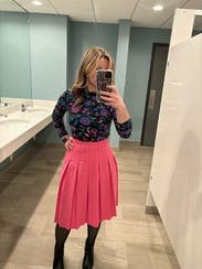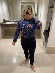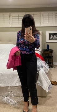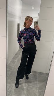 I love a good pattern, this one didn’t disappoint! The colors were super vibrant and really made a statement. The shirt fabric was silky yet tight, and really snatched tight to the skin for a fitted look. Loved this as a bold work look that could transition into a fun playful hour outfit! True to size.