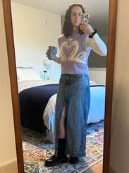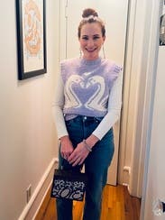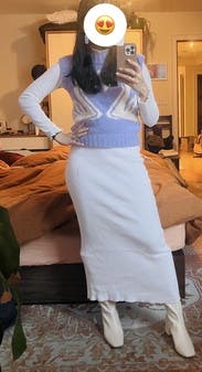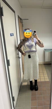 This sweater was a hit. Styled with a ribbed knit sweater and skirt for a cold day. Still look professional enough for work but also a fun look.
