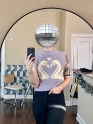 Fit well. Just a fun, unique sweater vest full of irreverent style. Gotta love some purple and swans in your life 💜