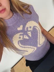 Fun vest with cute swans. It's warm. I did not find it itchy. Easy to layer with!
