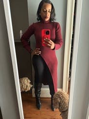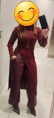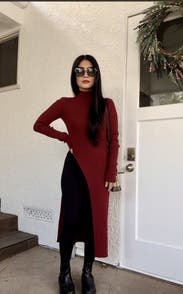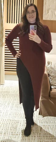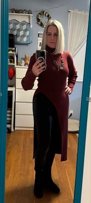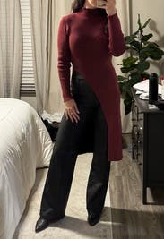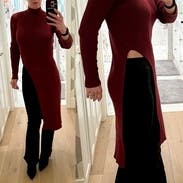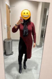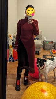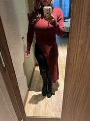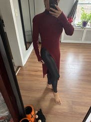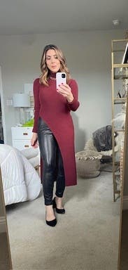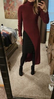 It’s nice and warm and super cute. The slit is a little high so either wear high waisted pants or show some skin. Size was perfect so maybe size down.