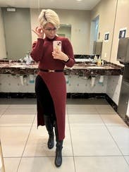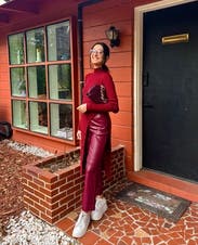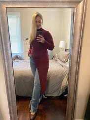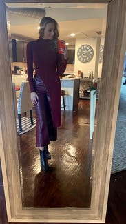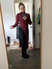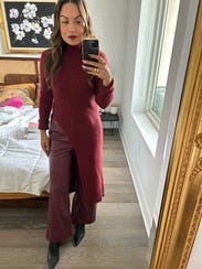 Perfect elevated look for a casual/business casual office holiday party. Warm and comfy, figure hugging in a good way.