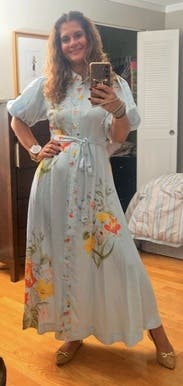 So adorable, comfy, but perfect for the baby shower. Top is sheer-ish and I needed a skin tone bra (which I did not have with me…received dress OOT), but it was fine. Steamed up easily. Highly recommend. NWT so I went with the recommended size of 16 when largest I ever wear is 12. But there were no customer reviews yet so I went with it. Luckily the belt helped. A 12 (TTS) would have been fine.