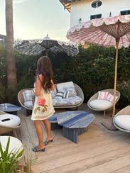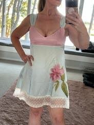 This dress is very pretty with light, airy fabric that feels perfect for a summer evening. The lace hem adds a delicate touch, but it also makes the dress quite short—something to keep in mind. Personally, I wore it on vacation and paired it with the perfect sweater, which I loved. While it felt a little young for me, I still really enjoyed renting it once for the right occasion.
