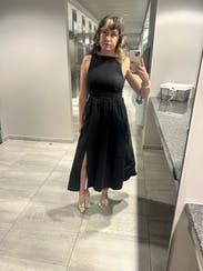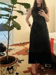 I liked this dress even more than expected. The cut is flattering and the back is super pretty. It’s basically a black denim so not super fancy but makes it versatile to dress up or down. Slit and length are also nice.
