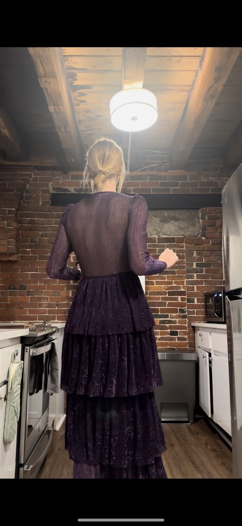 Sparkle and shine at your next event in this metallic tiered skirt gown by ASTR. Lean into the effortless movement of this fab frock when you wear a statement shoe to show off the subtle side slit.