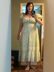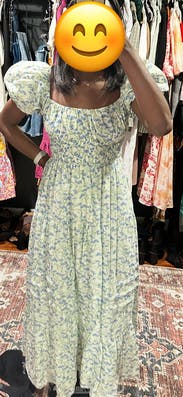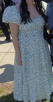 I absolutely adored this dress! 🩵💚 The puff sleeves and airy floral print gave it such a feminine, princess-like feel. I styled it casually with sneakers and simple accessories and received compliments all day. The sleeves and silhouette are a natural head turner. It’s one of those pieces that can easily go from day to night based on accessories. So versatile, flattering, and effortless! I usually order sizes 0-2/XS and went with an XS for this dress, it fit perfect. I will say, there’s no zipper on this one and it’s super stretchy, if in between sizes, I’d size down.